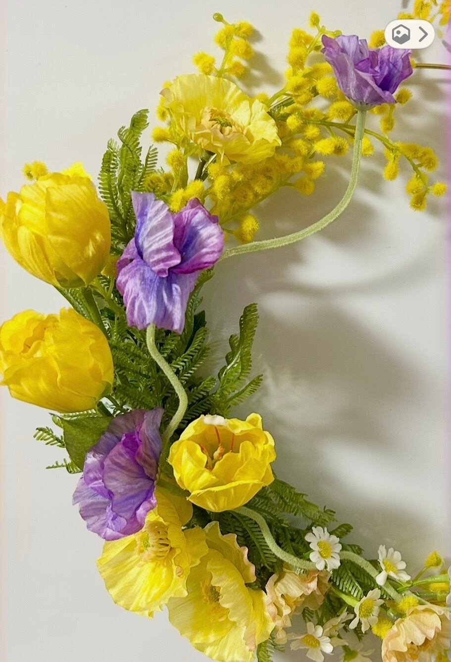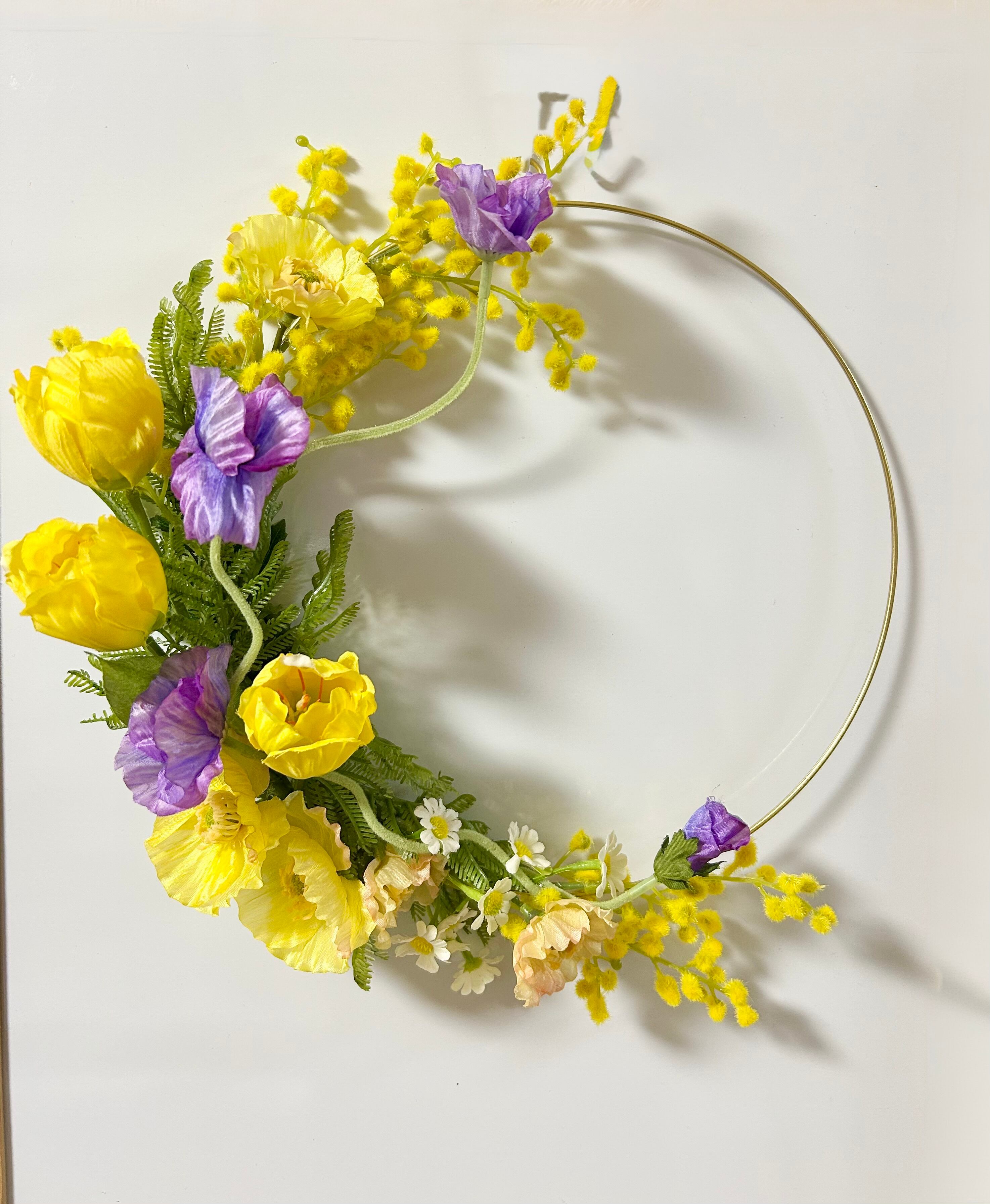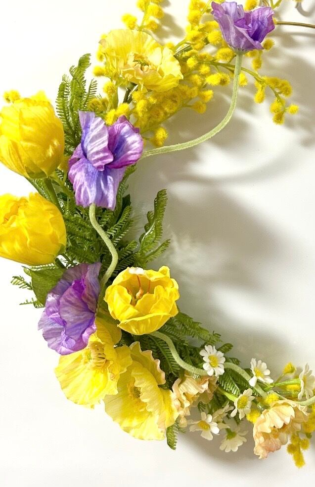 華やかな「ミモザリース」が新登場です!サイズ28cmの美しいリースに、ボリューム感のあるチューリップ部分が30cmで存在感抜群のデザインが特徴です。このリースは、ミモザ、チューリップ、ポピーが贅沢にアレンジされており、ポピーの曲線が可愛らしさを引き立てます!