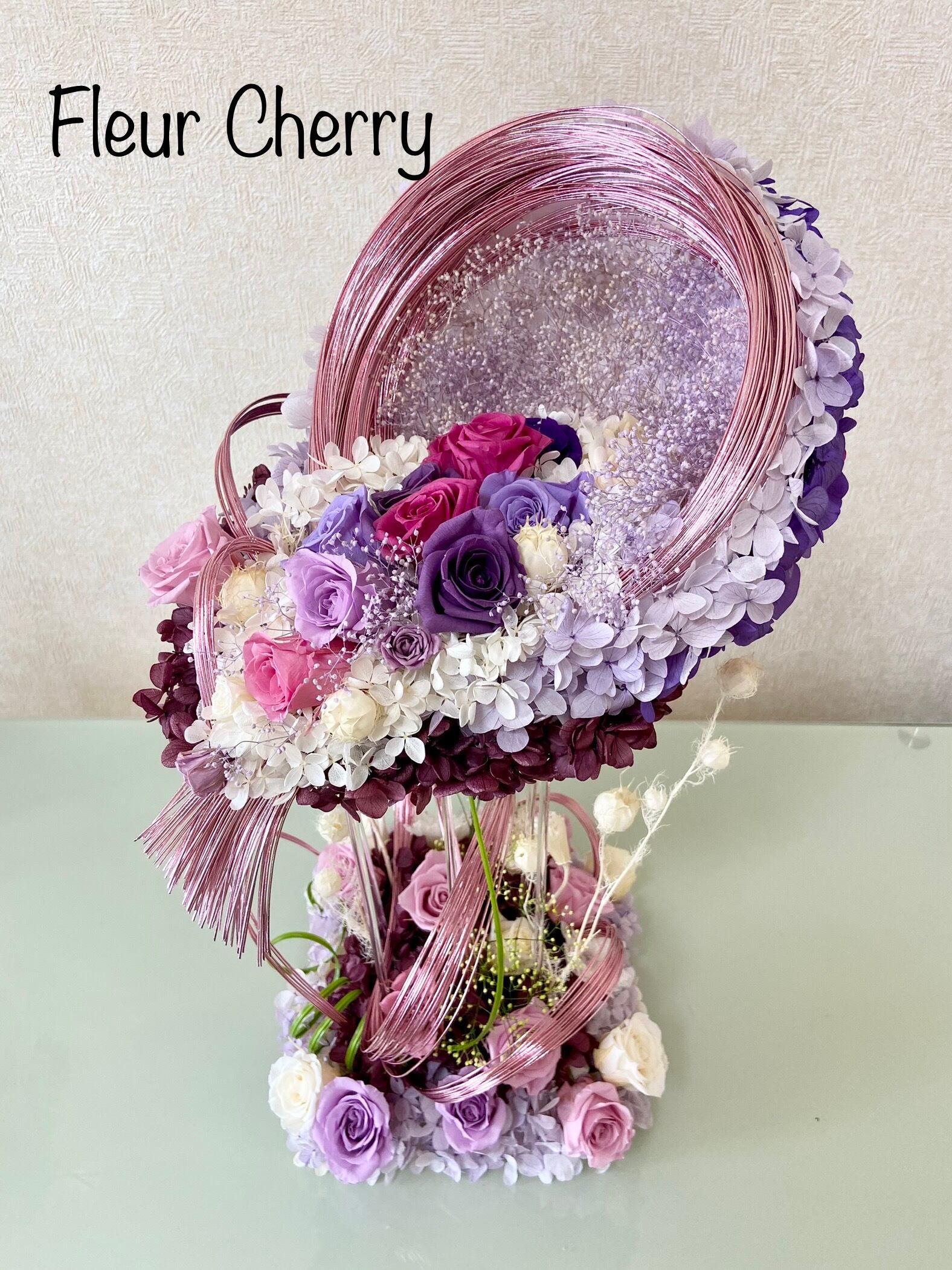 半球状の水引を用いた花のアレンジメントです。華やかな薔薇が溢れ出るデザインで、一つ一つの水引の線が作品を巡っています。高さ50cm、縦横25cmという大きなサイズなので、存在感も抜群です。