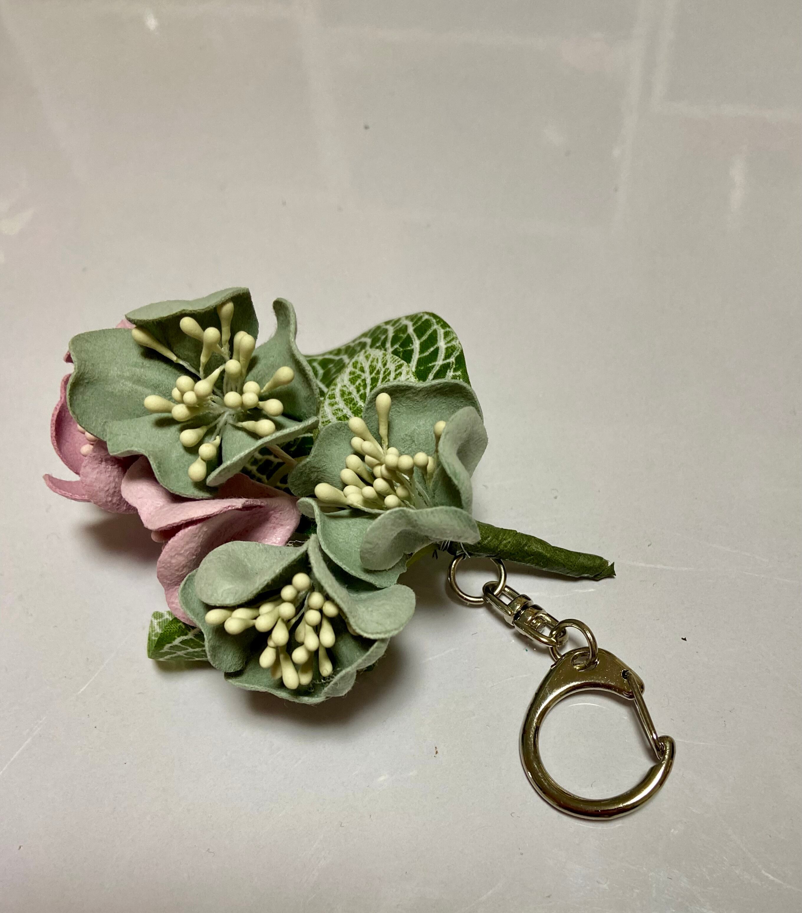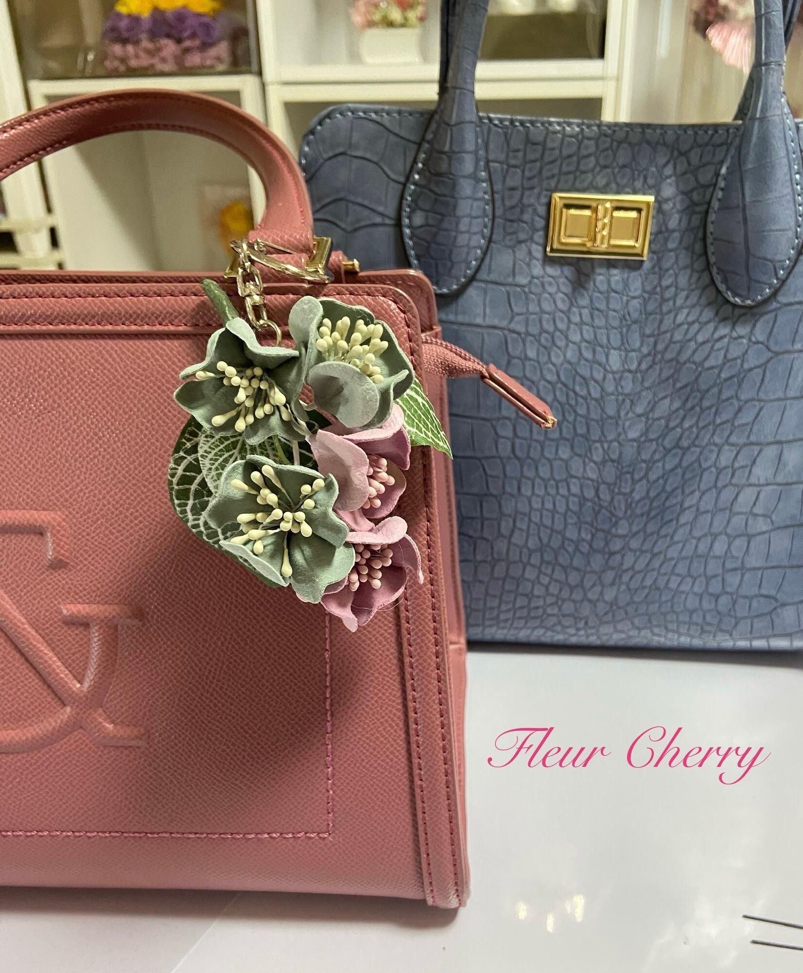 バッグや鞄につけて、おしゃれを楽しむためのバックチャームが登場しました。ピンクとグレーグリーンの可愛らしい色合いが、春らしい爽やかさを演出します。サイズは5cmで、バッグの持ち手やファスナー部分に簡単に取り付けられるキーチェーンが付いています。